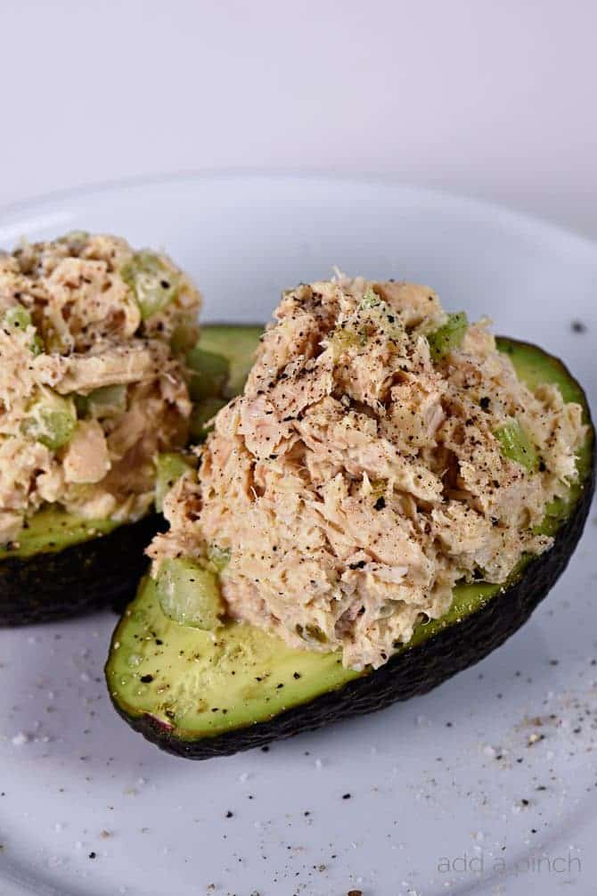 This Tuna Salad recipe makes a delicious, flavorful recipe perfect for lunch or a light supper! Stuffed into an avocado, as a sandwich or served on a lettuce leaf!
