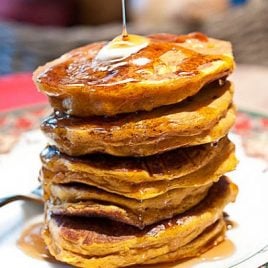 Fluffy pancakes infused with pumpkin puree and warm spices, like cinnamon and nutmeg. Ready in 20 minutes, these are a fall favorite.