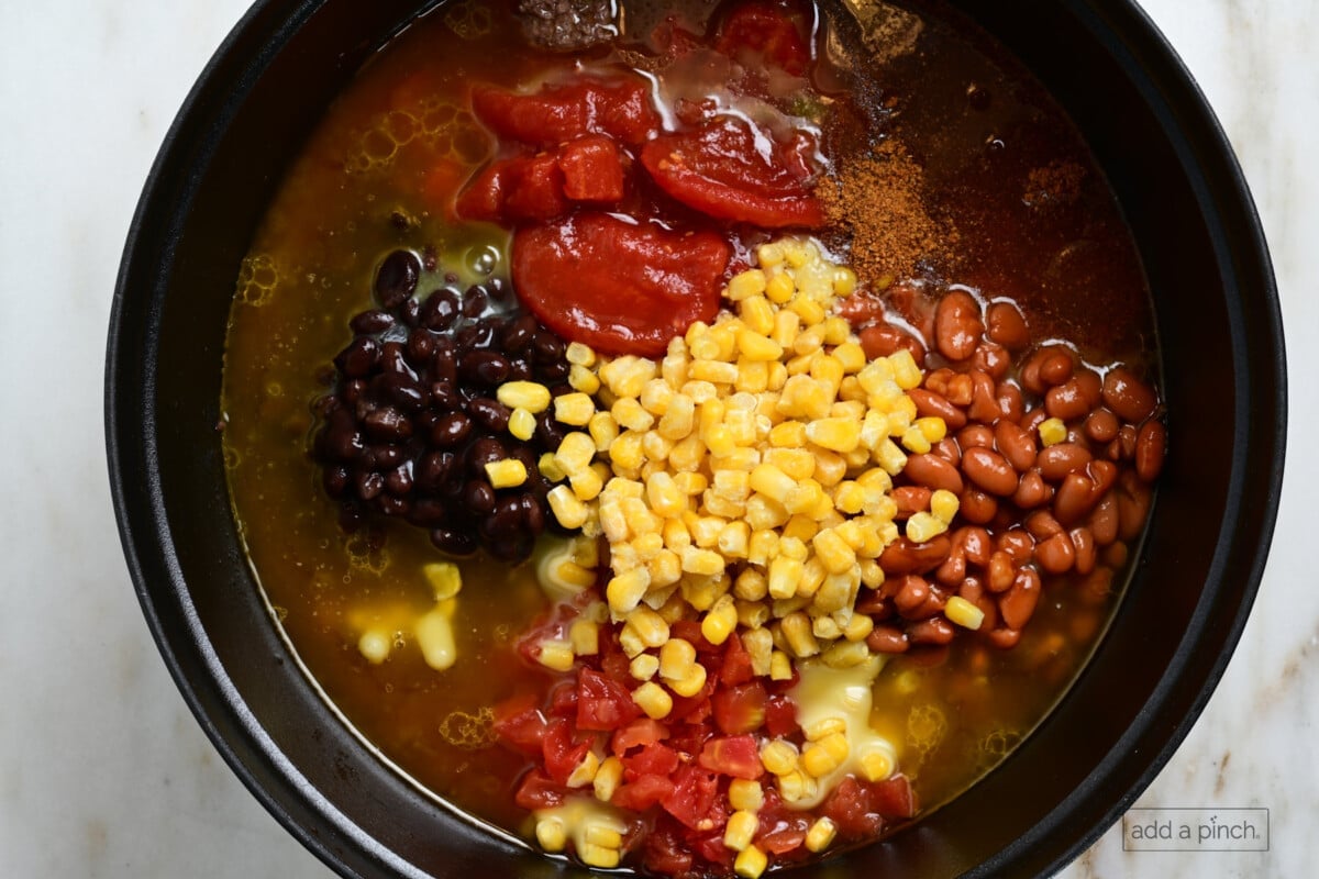 - Cook ground beef in a large skillet over medium heat until browned, about 5 minutes. Drain excess fat. Pour the browned meat into the slow cooker. Add taco seasoning, water, black beans, corn, chili beans, tomatoes, ranch seasoning, and the green chilies. Stir until well combined.